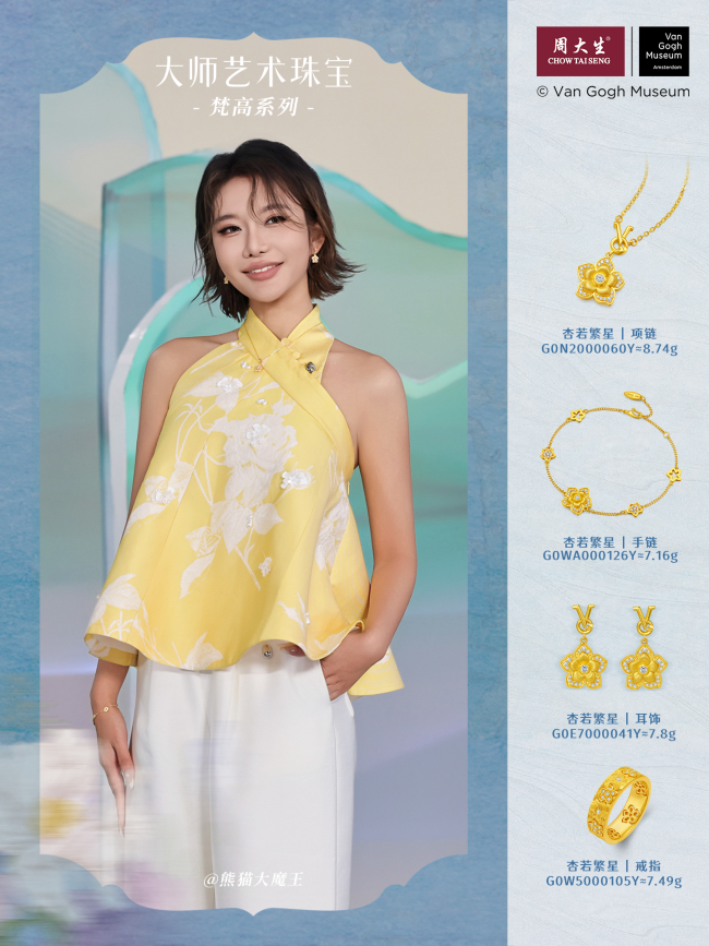 在无忧之夜2025的红毯大秀上,光影交错,如梦如幻。周大生大师艺术珠宝·梵高系列璀璨亮相,宛如开启了一扇通往梵高艺术之境的大门。百万粉丝博主、无忧达人熊猫大魔王佩戴该系列的“杏若繁星”登场,仿佛从梵高的画作中走出的精灵,灵动而耀眼。“杏若繁星”以梵高名作《盛开的杏花》为设计灵感,将画布上的艺术神韵巧妙转化为可佩戴的珠宝美学。杏花在东西方文化中始终象征着生命、希望与蓬勃向上的力量。因此,“杏若繁星”不仅承载着自由与新生的美好寓意,更体现了艺术与情感的深度融合。它以独特的设计语言,悄然诉说着无言的故事,传递梵高笔下炽热的情感。
