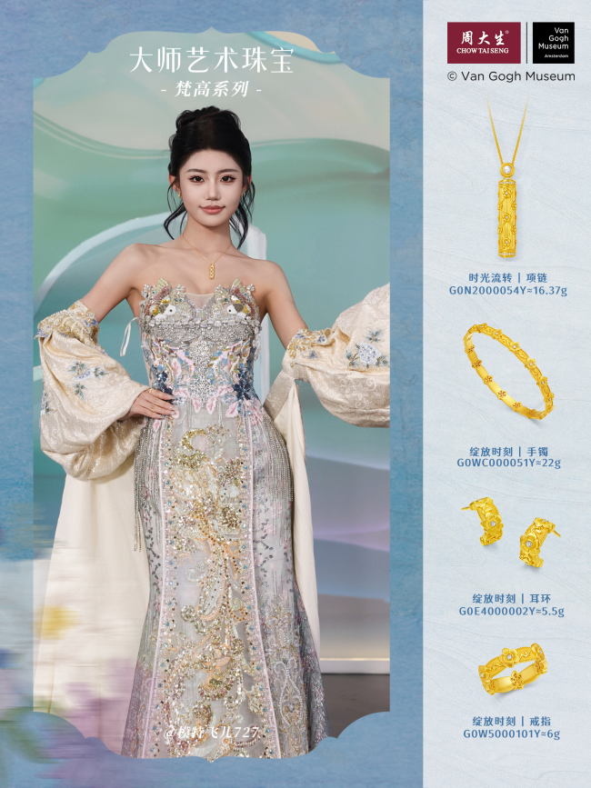 当岁月长河静静流淌,艺术的光辉总能在时光深处熠熠生辉。无忧达人,模特飞儿727佩戴梵高系列“时光流转”“绽放时刻”优雅登场,鎏金花雨随之绽放,尽显诗意之美。“时光流转”“绽放时刻”设计灵感源自梵高名作《盛开的杏花》,传递出盎然的生机与希望。“时光流转”“绽放时刻”巧妙地将画中象征希望与新生的杏花,与象征力量与永恒的黄金相融合,致敬梵高艺术中那份在挣扎中绽放、于柔韧中见刚强的生命哲思。每一朵杏花,都似在诉说着爱与希望的故事,都承载着坚定与永恒的力量。当自然之美与黄金交织,不仅展现了艺术的视觉美感,更传递出那份深沉而坚韧的浪漫情感。