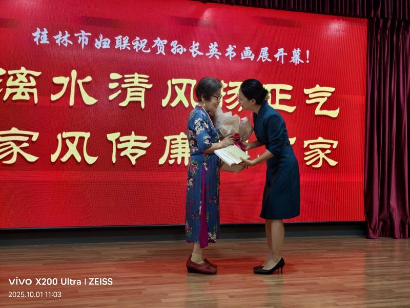 随后,桂林市妇联主席陈薇薇上台,代表市妇联向孙长英女士表达敬意与祝福,现场赠送鲜花一束及两本关于家风建设与传统书画的书籍,并邀请孙长英女士及其家人一同登台合影,以实际行动传递对“优良家风+艺术传承”模式的认可与推广,希望通过孙长英的案例,让更多人在欣赏艺术之美的同时,读懂家风传承的力量,推动家庭和睦与社会和谐。