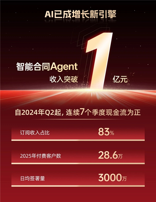 2025年,e签宝实现了一项关键突破:其智能合同Agent相关年收入突破1亿元人民币,标志着其AI驱动的产品商业化步入规模化阶段。公司整体业务保持稳定,订阅收入占比达83%,年度付费客户数量为28.6万家,日均电子签署量超过3000万次,并已连续七个季度实现经营性现金流为正。