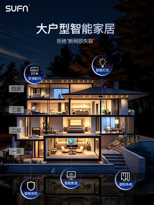 SUFN OS系统的核心竞争力首先源于其技术底层的原创性突破。作为行业内少数拥有完全自主底层代码的智能家居品牌,三峰大量投入研发资金,拥有5项核心技术专利,其中行业首创的无线跨网关技术彻底解决了大宅空间信号覆盖难题,真正实现“断网不断连”——即使家庭网络中断,系统本地逻辑仍可稳定运行,确保安防、照明等核心功能不受影响,为别墅、大平层等空间提供全天候的智能安全保障。
