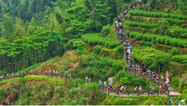 这一日,选手们从全新落成的山哈文化公园启程,一路盘旋环绕、起伏跌宕,串联起草鱼塘森林公园的苍翠林海、云雾缭绕的高山草甸、层层叠叠的茶园和隐匿山间的千年古村,向山而行。脚下是“春深草木生”的小径和“苔痕上阶绿”的青石板,身旁是茂林修竹、溪涧清流,抬眼是云卷云舒、山峦叠翠,春日清风裹挟着草木清香与山花芬芳扑面而来,每一次呼吸都是负氧离子满满的山野馈赠,每一步跨越都能邂逅截然不同的敕木山风情。