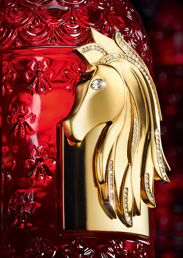 光彩夺目的镀金骏首精心镶嵌 79 颗施华洛世奇水晶,华丽装饰蜂印瓶独具特色的修长外观,欢庆中国新春佳节。切割成杏仁形状的水晶为骐骥点睛,78 颗圆形水晶则沿着马鬃线条次第铺陈。
