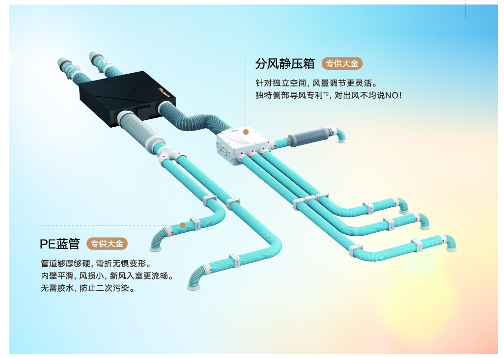 管道材质至关重要:优质管道应具备内壁光滑、抗菌抗尘、环保的特性。大金定制PE蓝管采用环保材质,其光滑内壁设计可减少风阻与气流噪音,而环保属性则避免了管道自身可能带来的二次污染。