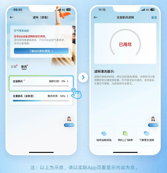 滤网的效能会随时间衰减。大金会主动智能监测滤网时效,实时提醒用户滤网更换,随后由专业工程师提供上门服务。用户也可以自行登录“金制空气”APP查看滤网进度,便捷省心。